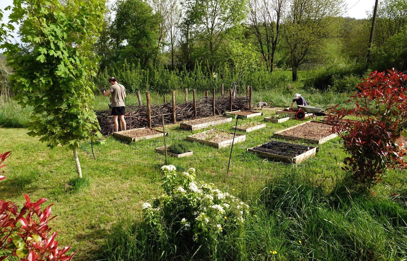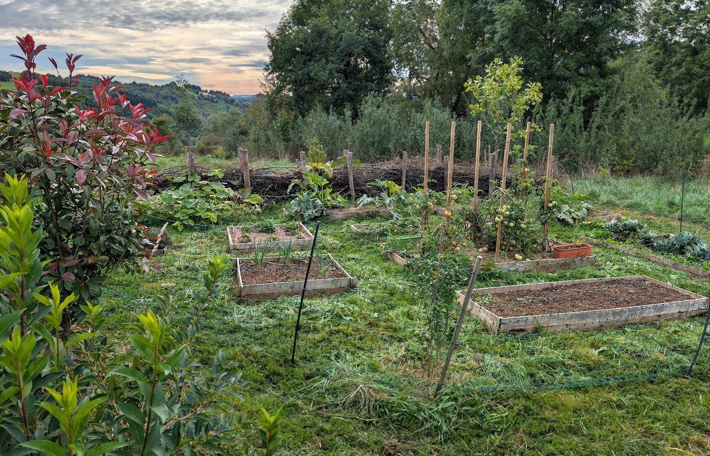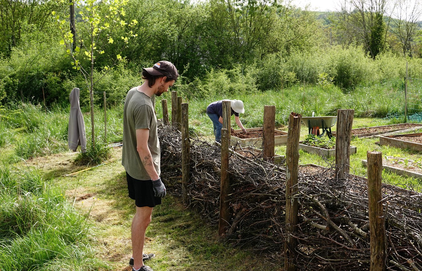 Une haie sèche (ou haie de Benjes) protége le potager du vent et de l'intrusion des chats.