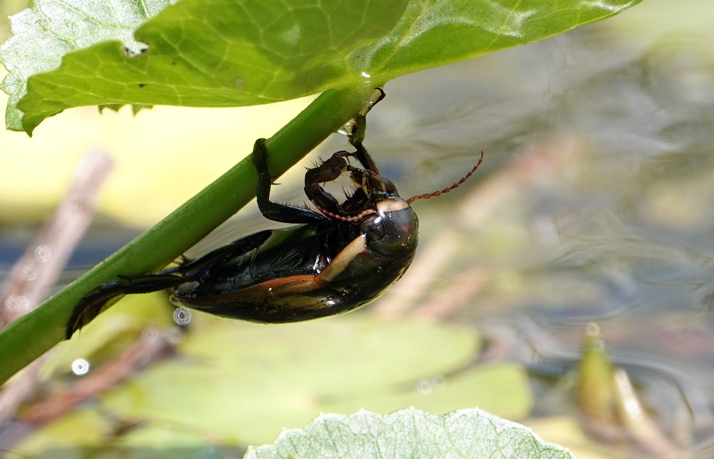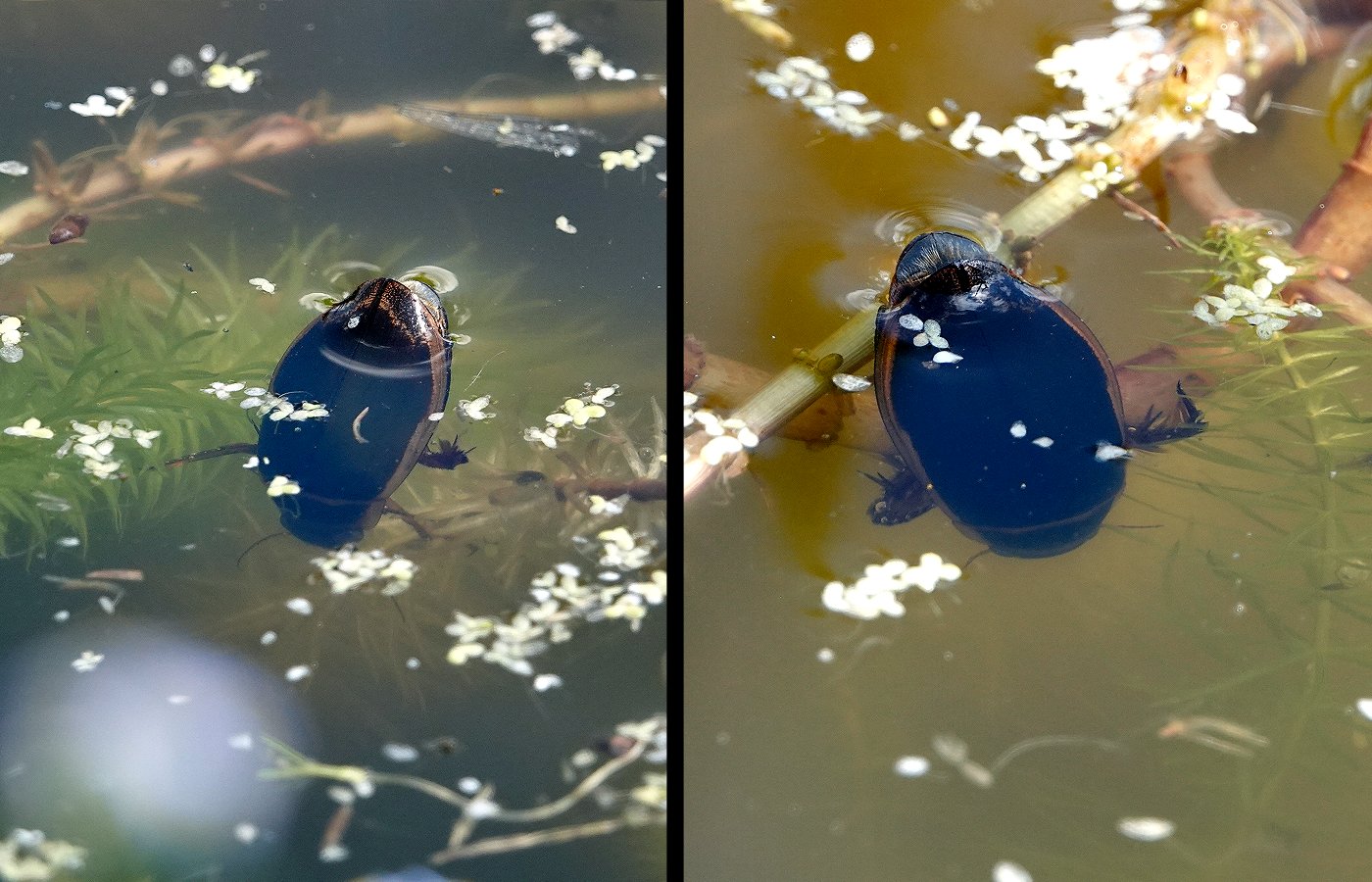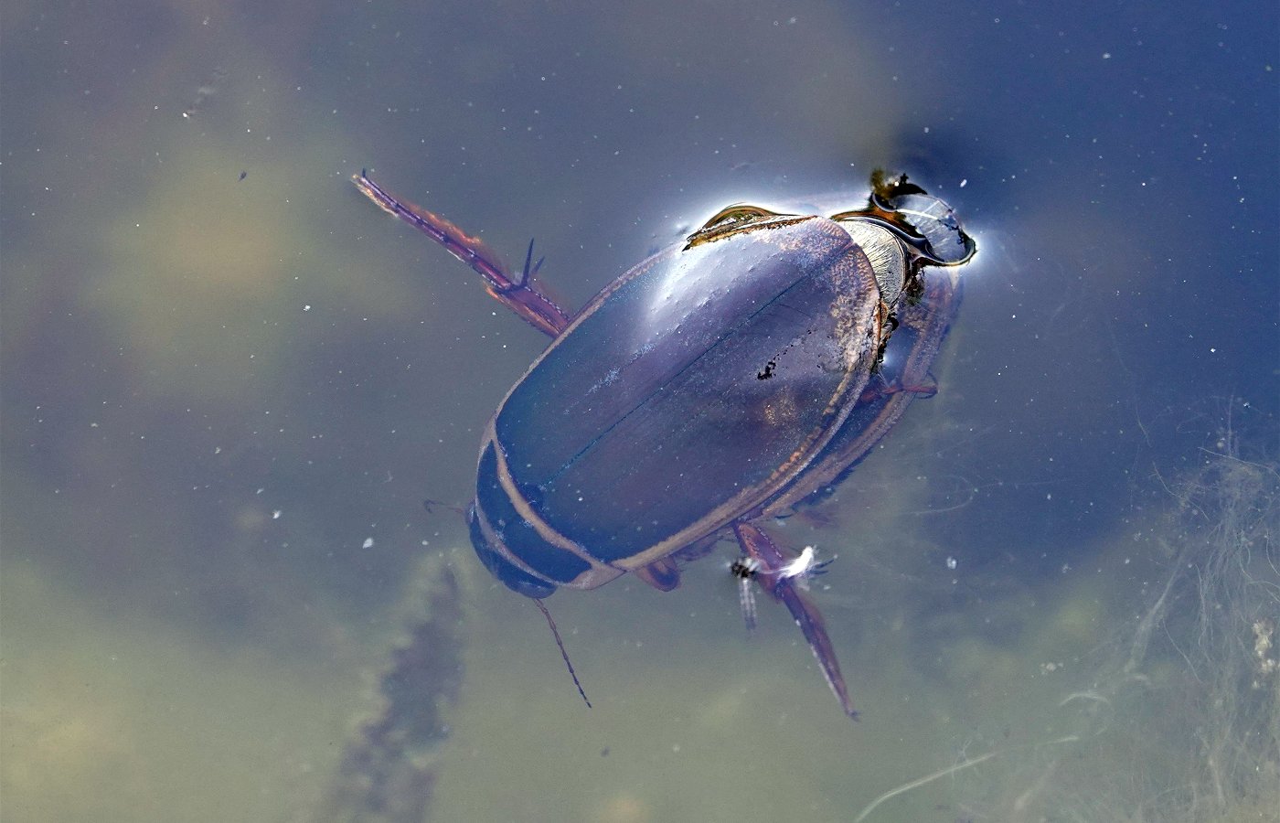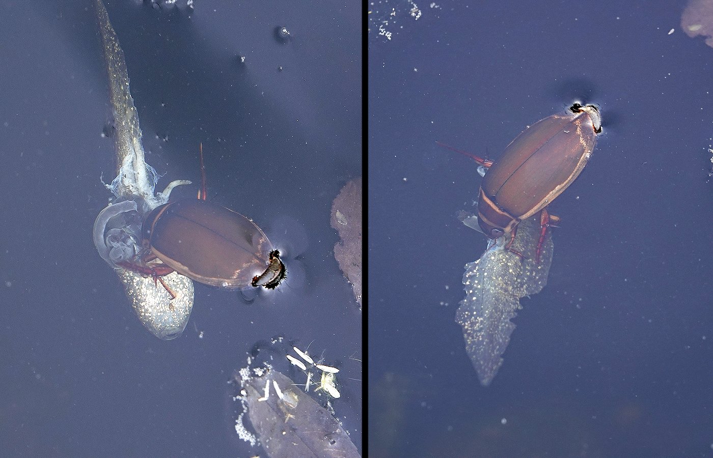 Le dytique (en train de respirer à la surface sur les photos), l'un des plus gros prédateurs de la mare.