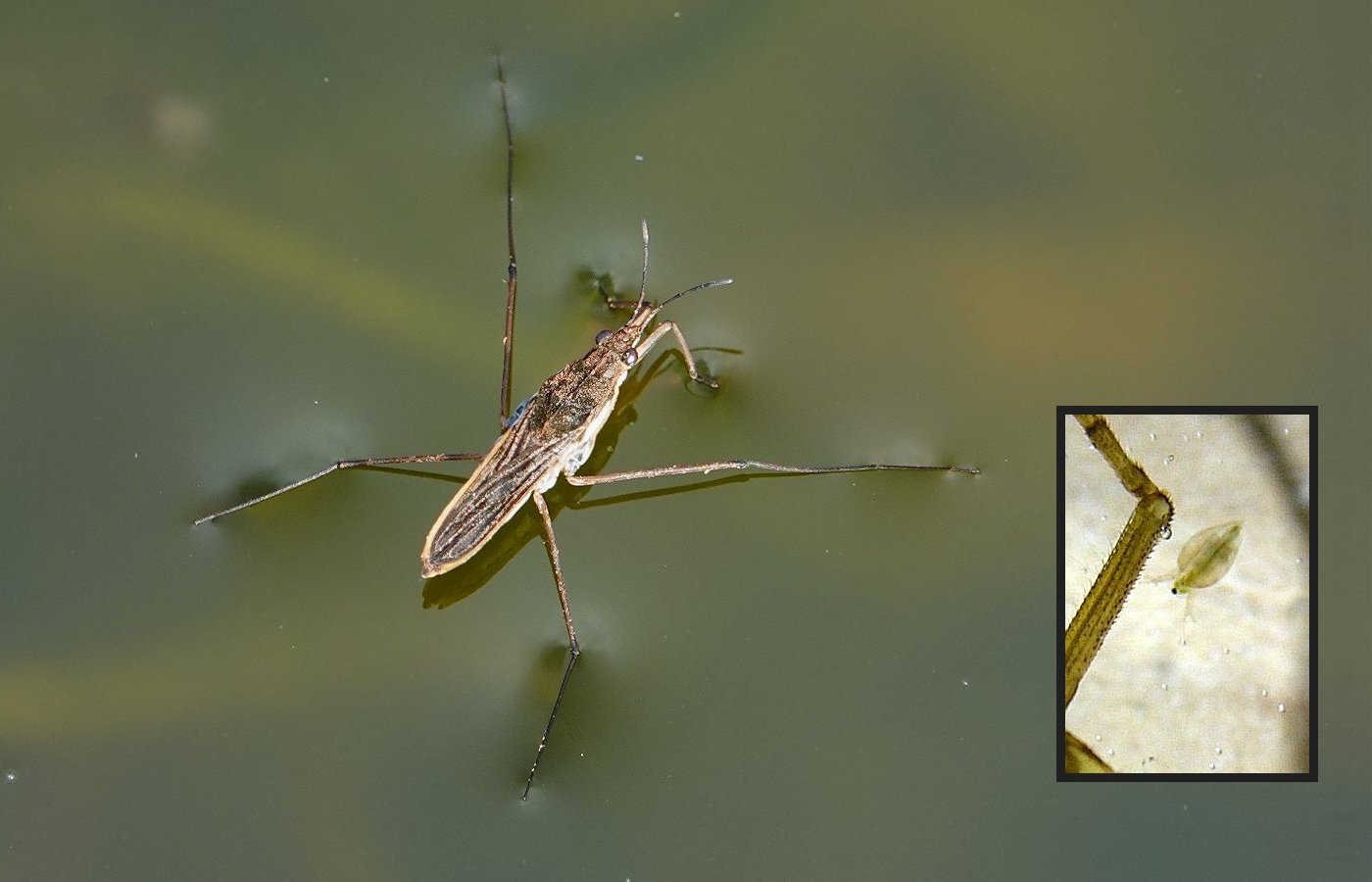 Gerris + en médaillon une daphnie, minuscule crustacé, à coté d'une patte de larve de libellule.