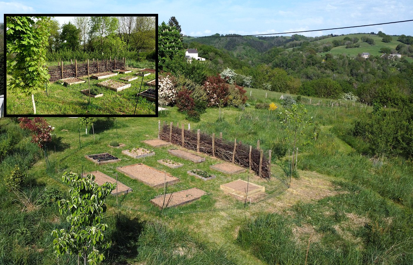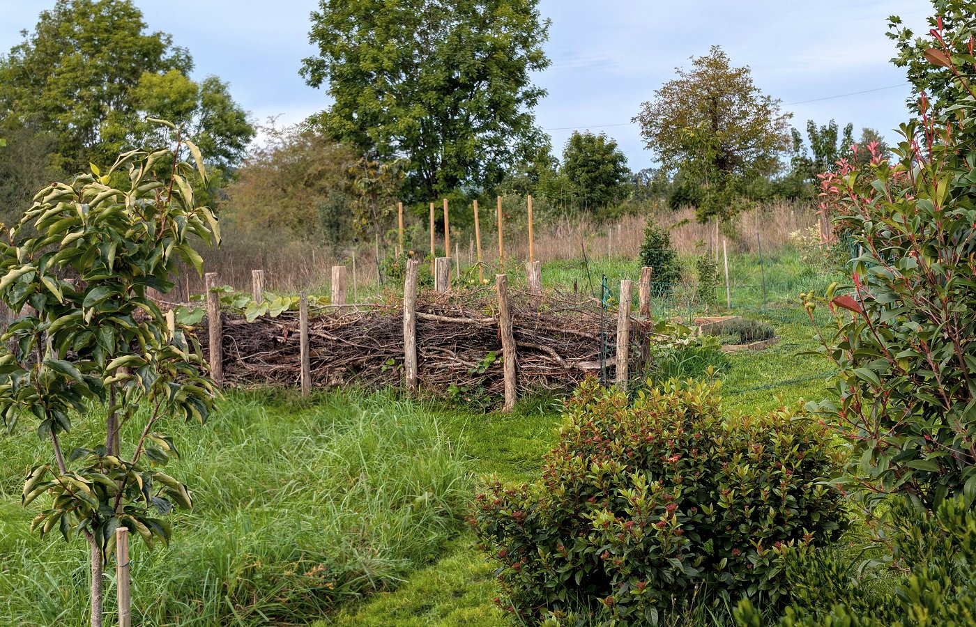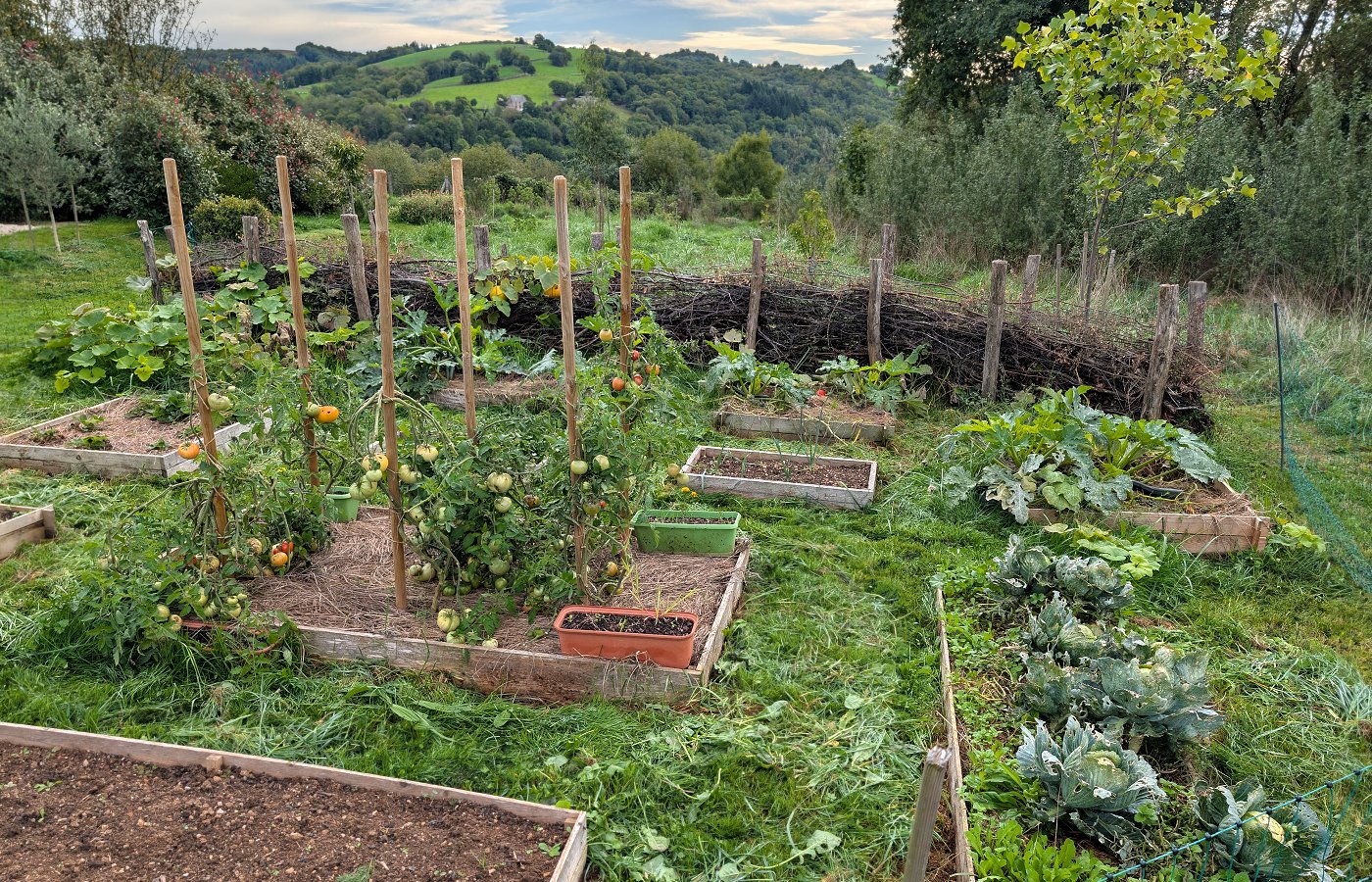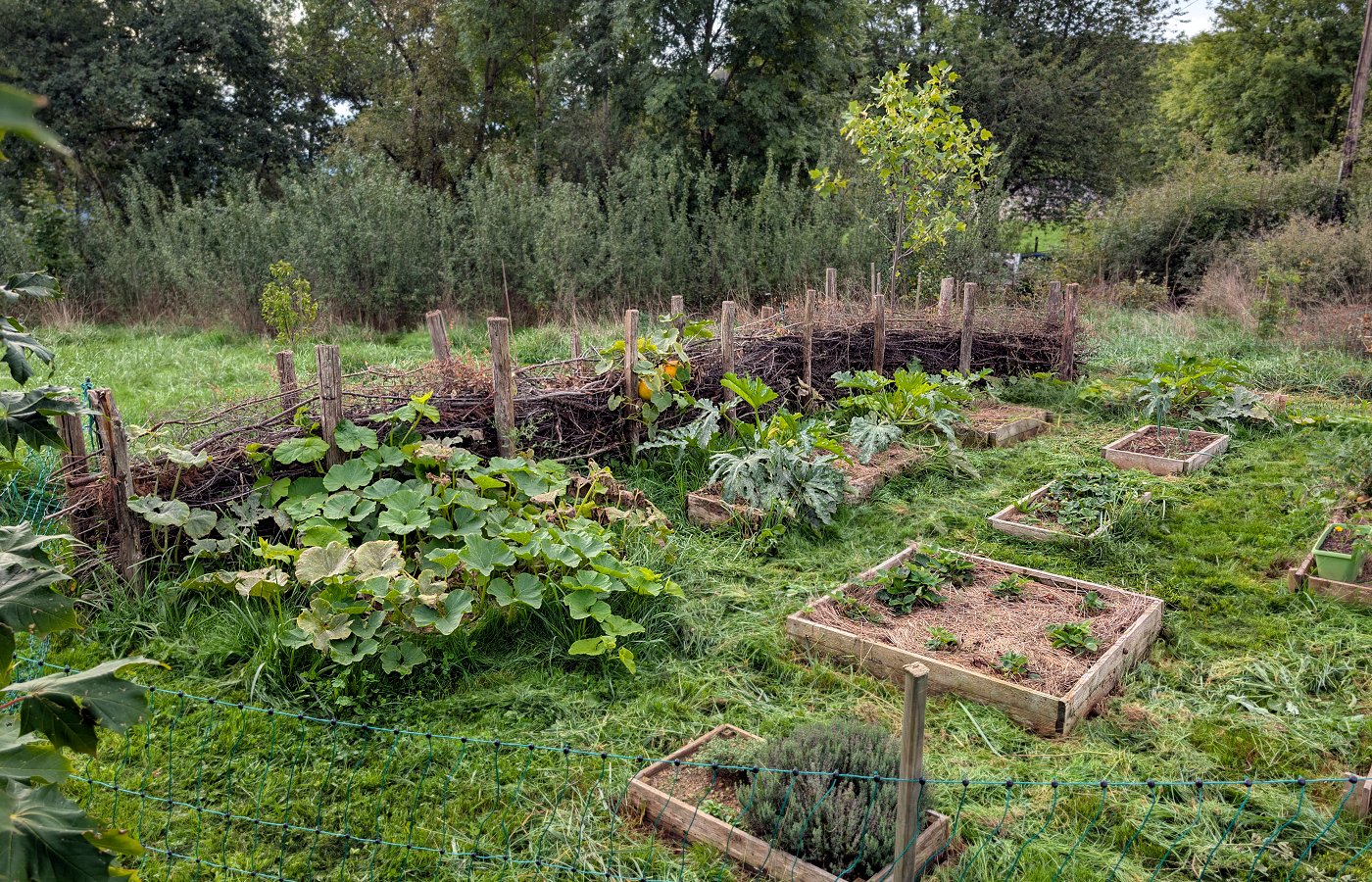 Une haie sèche (ou haie de Benjes) protége le potager du vent et de l'intrusion des chats.