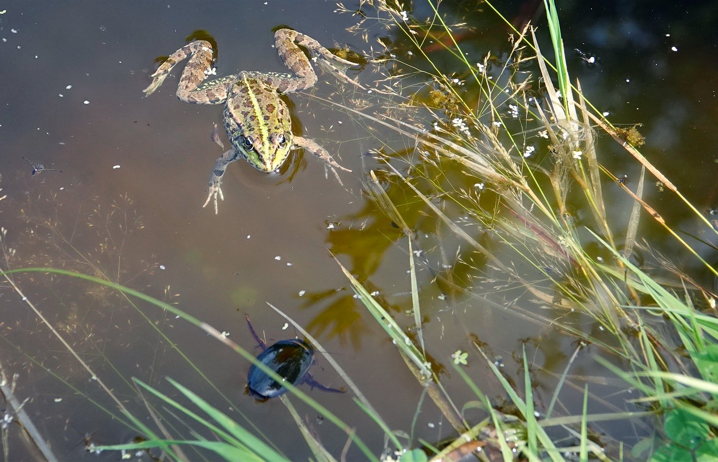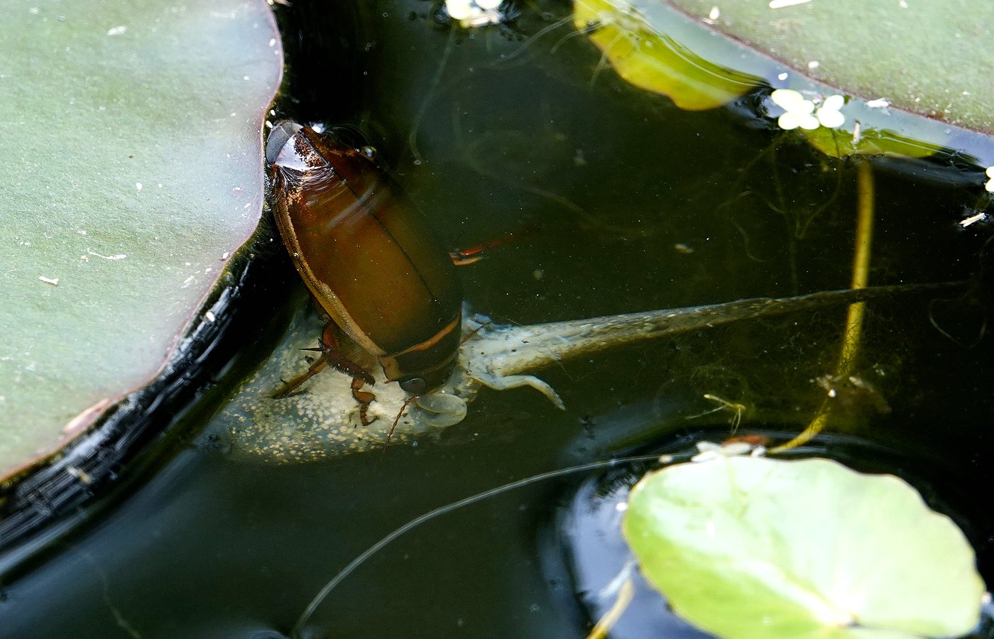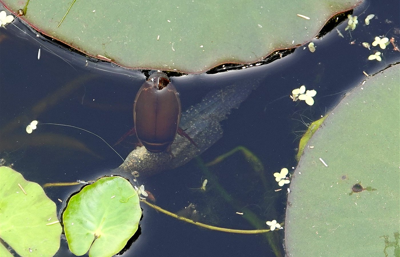 Le dytique (en train de respirer à la surface sur les photos), l'un des plus gros prédateurs de la mare.