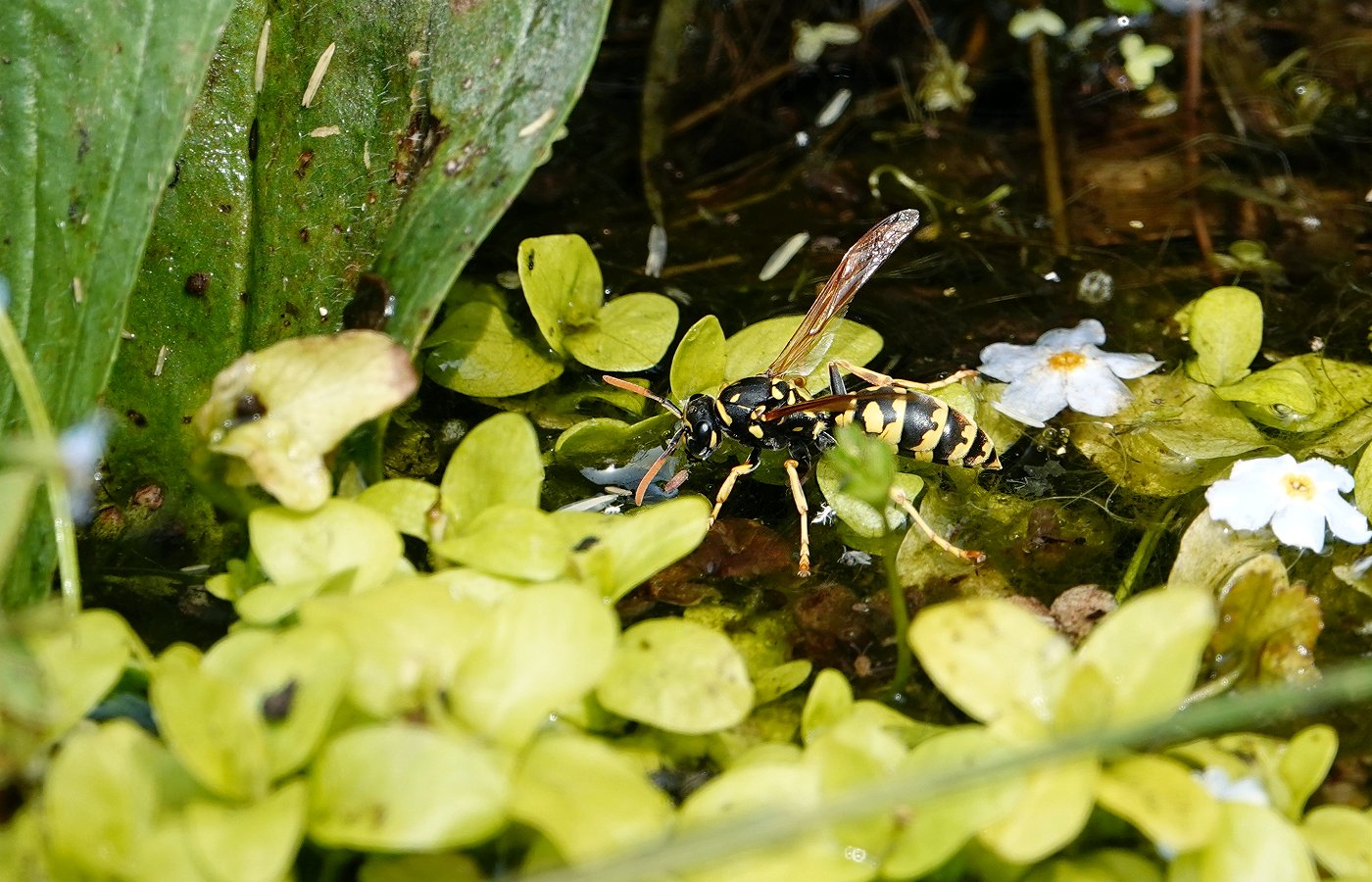 + une guêpe assoiffée qui profite aussi de la mare.