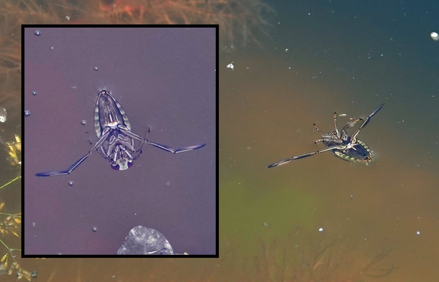 Gerris + en médaillon une daphnie, minuscule crustacé, à coté d'une patte de larve de libellule.